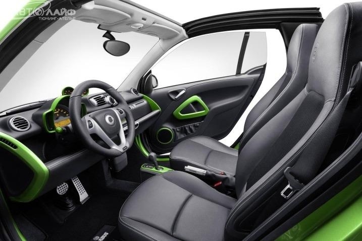 Утонченность стиля Smart подчеркивает оригинальное цветовое разрешение: как снаружи, так и внутри авто окрашено в черный и ярко-зеленые цвета.
