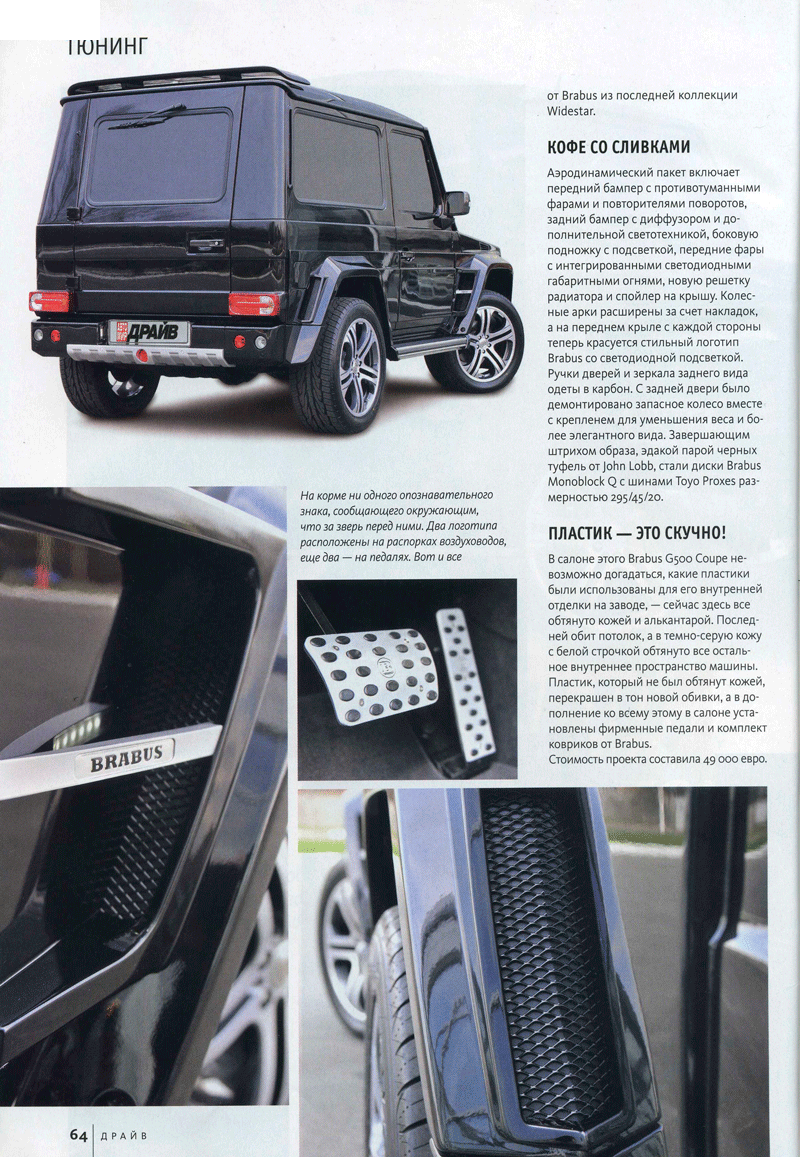 Проект обратил на себя внимание редакторов известного журнала «Автомир.ДРАЙВ» и был опубликован в сентябрьском номере издания. Предлагаем вашему вниманию описание обновленного Mercedes G 500 Coupe в редакции ИД "Бурда-Украина".