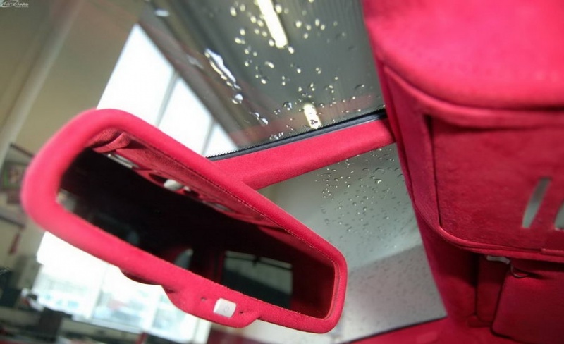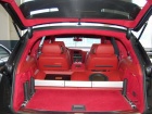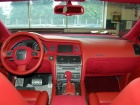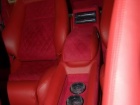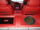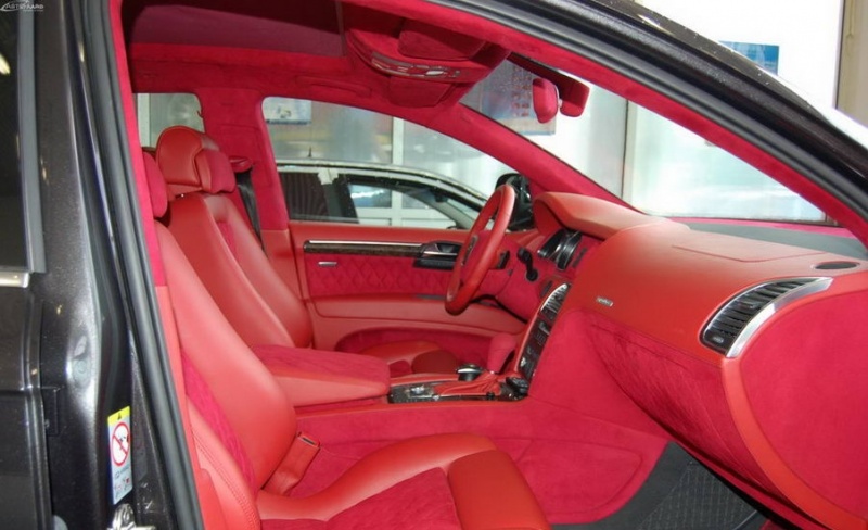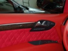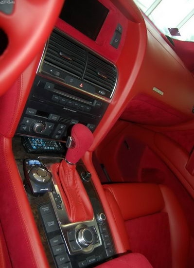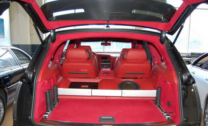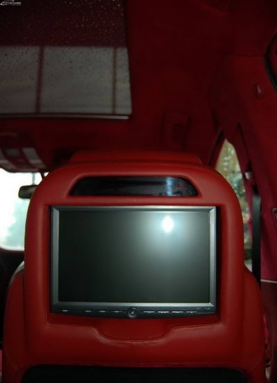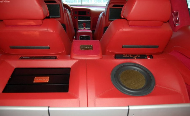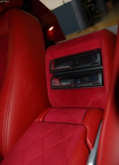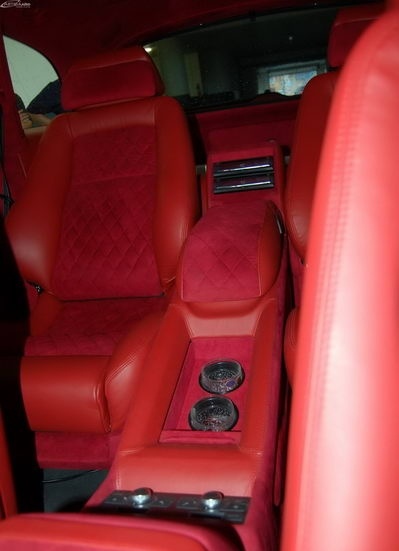 Была произведена очень большая работа по доработке интерьера этого автомобиля: замена передних и задних сидений на ортопедические кресла Recaro, изготовлена задняя консоль, встроен холодильник и мини-бар, усовершенствована аудиосистема, произведена полная шумоизоляция салона, установлены автономные мониторы в передние сидения. Интерьер выполнен в красных тонах. Используемые материалы: алькантара, кожа.